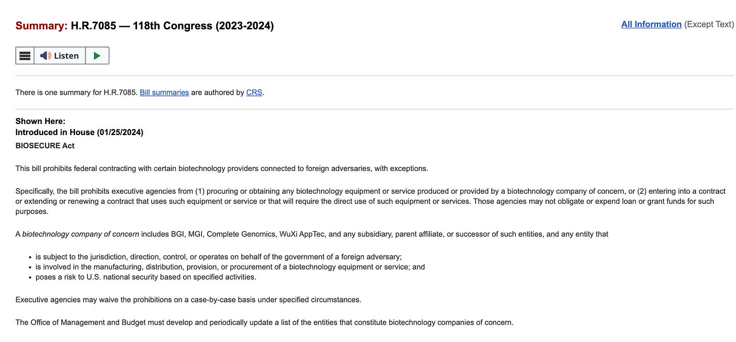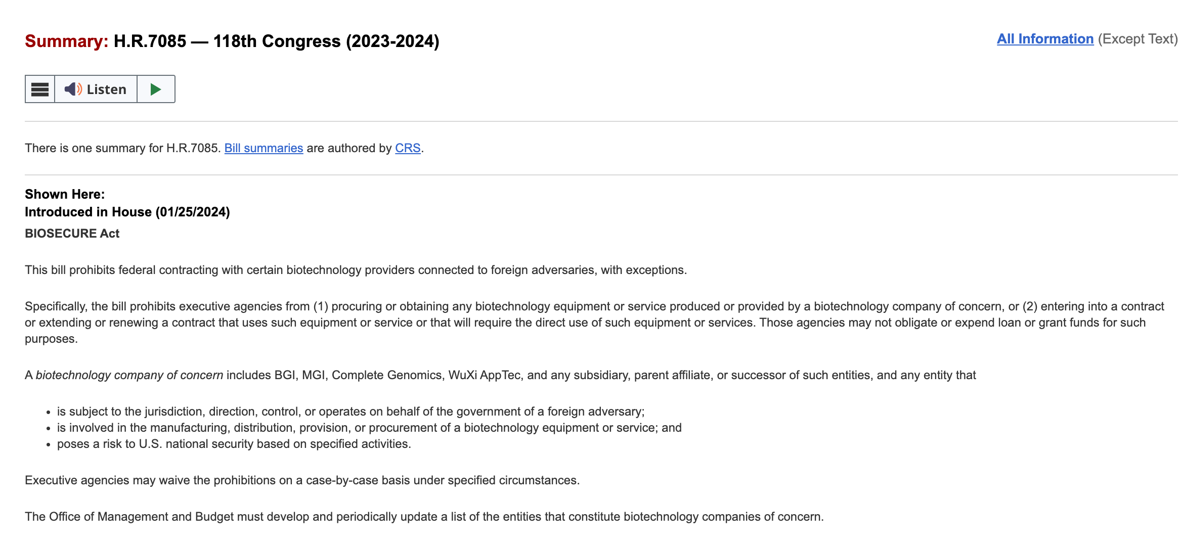 The bill (remember, it’s not a law until it passes + the president signs it into law) aims to tackle perceived biosecurity threats by restricting US companies from engaging with Chinese biotechnology firms. Specifically, the ones listed above. If passed, the Act sets out to end government contracts (e.g., Medicare + Medicaid, NIH grants) for US firms that work with “biotech companies of concern.” If it feels paternalistic to you, let’s talk about it.