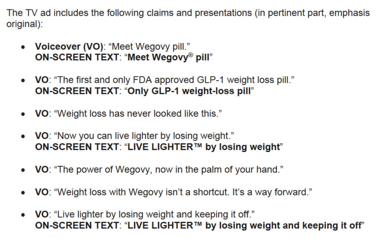 The FDA said Novo’s “Live Lighter” ad (premiered during this year’s Golden Globes) was misleading in an untitled letter dated February 5th. They flagged statements like “weight loss has never looked like this” and allusions to mental/emotional benefits beyond weight-loss imply the pill form is better than other GLP-1 formulations and can solve other life challenges, when they don’t have the data to back this up. My guess is Novo’s FDA submission package also doesn’t include evidence that the Wegovy pill can help you parallel park and rescue kittens.