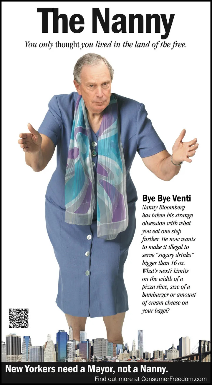 My thoughts on tackling chronic diseases? This is great! But will he work with other health agencies to ensure timely access to quality care? What about preventive services? He may have some misinformation on certain root causes and treatments, but he shares this end goal with both the healthcare industry and the general public. I already try to avoid ultra-processed foods, and it’s common knowledge that eating whole foods, fruits + vegetables, etc. is good for you. Food is medicine! But will he also push the government to address systemic issues that force some of us to heavily index towards ultra-processed foods? Think food desserts and the cost of fresh, whole foods. The other piece to note is Americans hate being told what to do. Let’s walk down memory lane. When NYC Mayor Michael Bloomberg tried banning large sodas (>16 oz) in 2012, New Yorkers and soda corporations fought back. The Center for Consumer Freedom bought ad space in the New York Times accusing Bloomberg of giving “nanny state” vibes. The amendment was repealed in 2015.