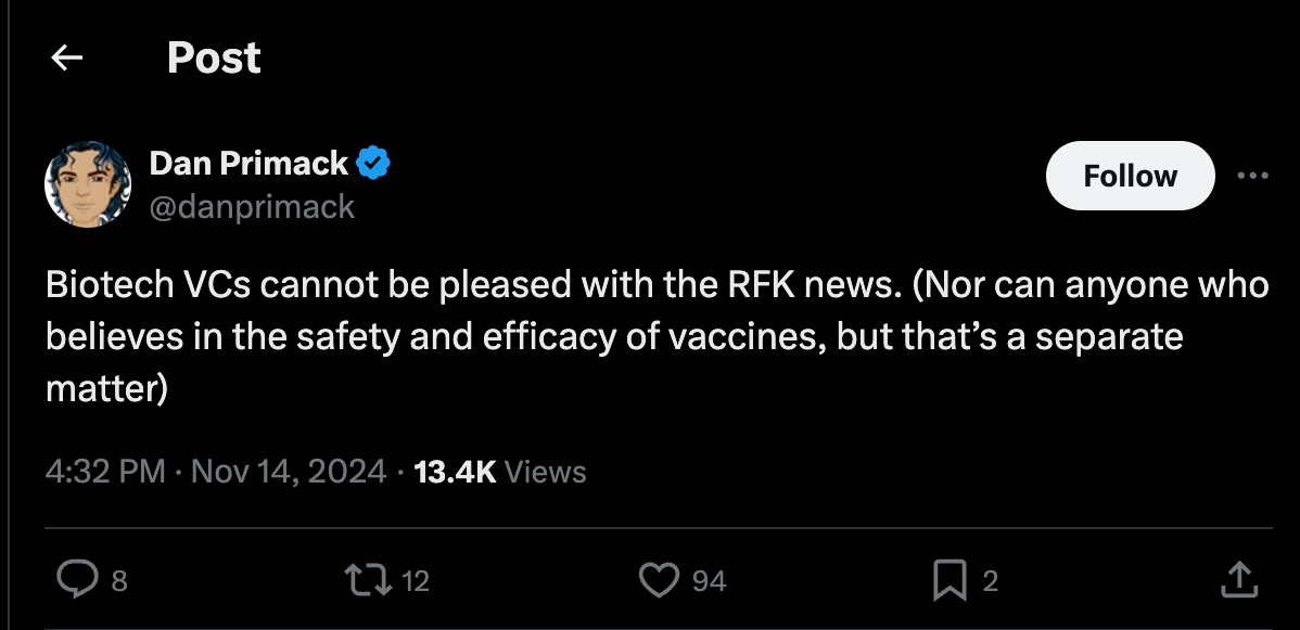 I fielded questions on this via texts, DMs, and IRL. I’ll share those thoughts with you because the topic fits within Of Note’s “On Health” newsletter ethos! It boils down to 1) what we know to be true about Kennedy’s health policy positions (not a lot!) and 2) what’s actually feasible. We know what the Market thinks about this. The SPDR S&P Biotech dropped after the announcement, and drugmakers like Pfizer, Eli Lilly, Amgen, and Novo Nordisk. Vaccine makers, the New York Times reported, lost over $8 billion in market value. I asked one of my Cambridge-based pharma colleagues how they’re talking about this in town, and she said everyone’s being very private about it. Fair! My advice to the industry? Stay calm and have some tact. Let’s get into it.