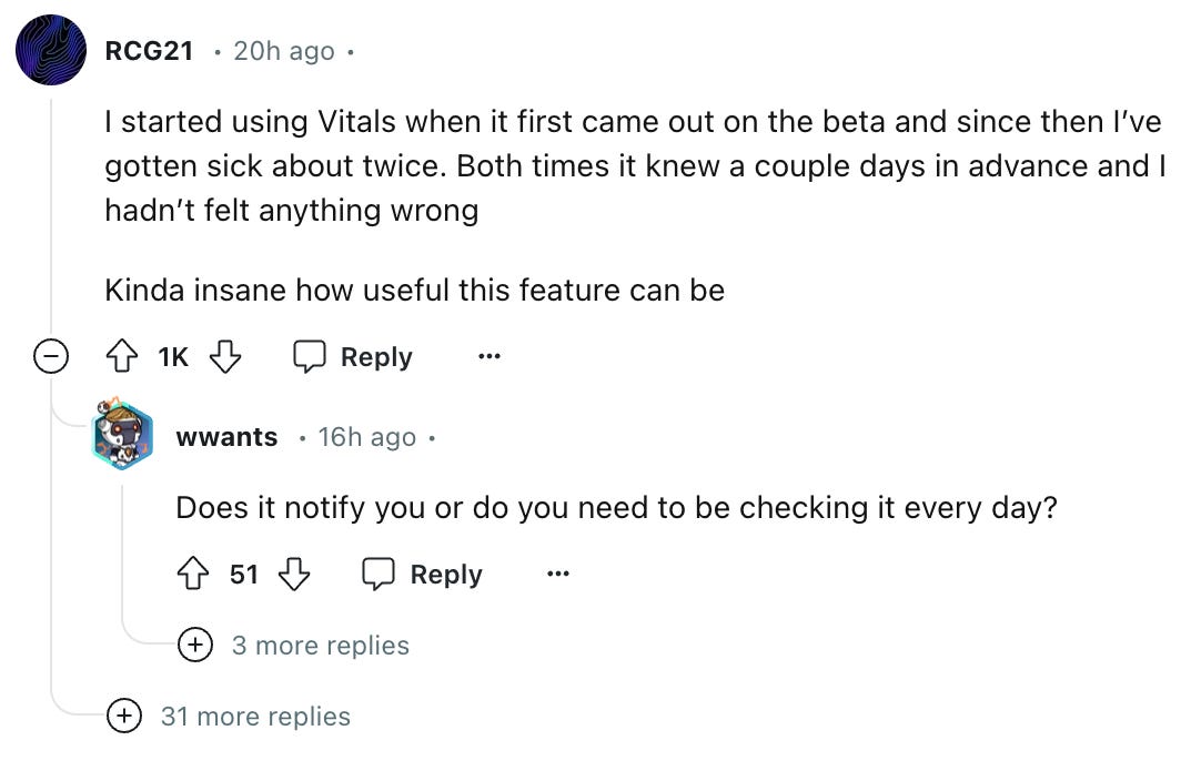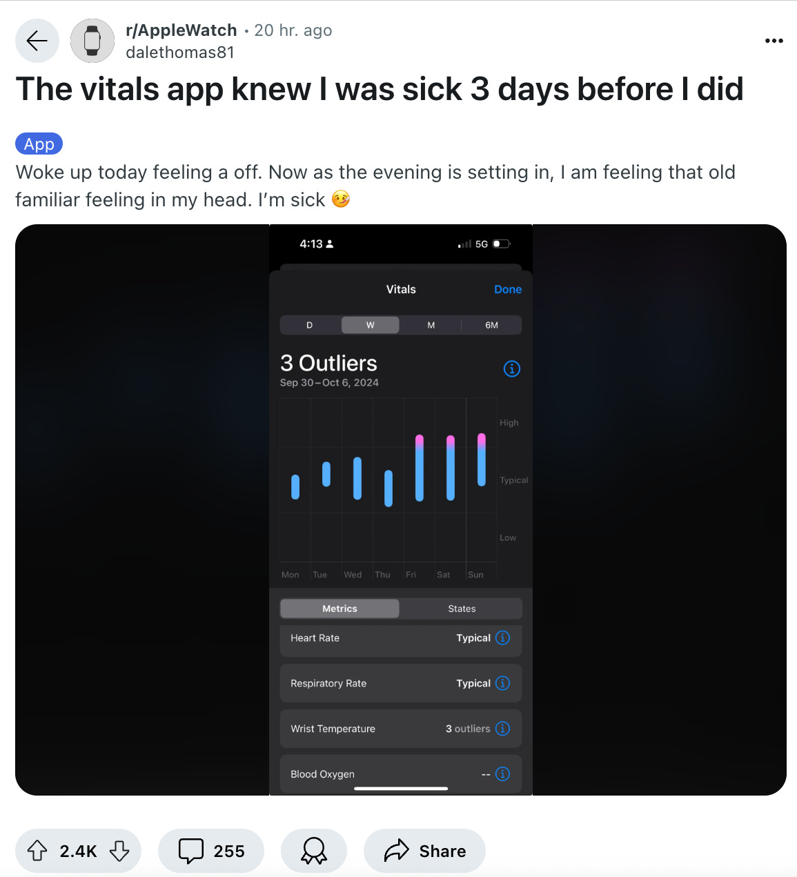 These market wins and technological advances are impressive. Yesterday, people on Reddit shared that the new AppleWatch Vitals App is flagging that they’re sick days before they actually felt it. This is likely due to temperature and/or heart rate changes.